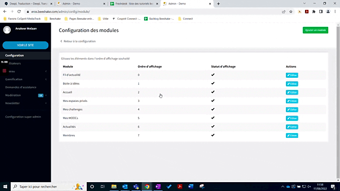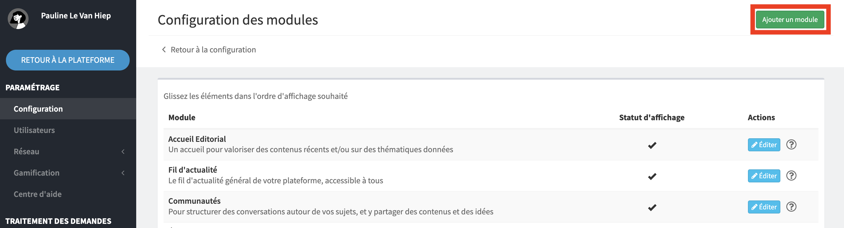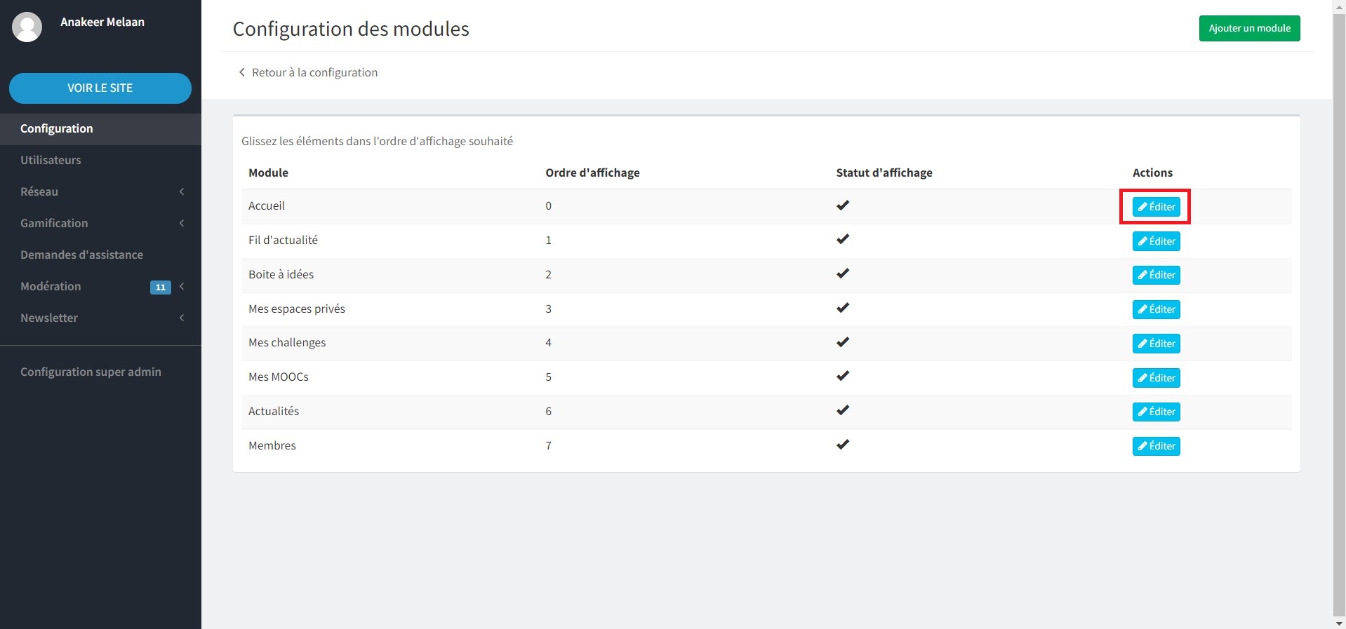 Vous pouvez dans paramétrage des modules, d'ores et déjà modifier l'ordre d'affichage des modules. Pour ce faire, sélectionnez le module et fait le glisser.