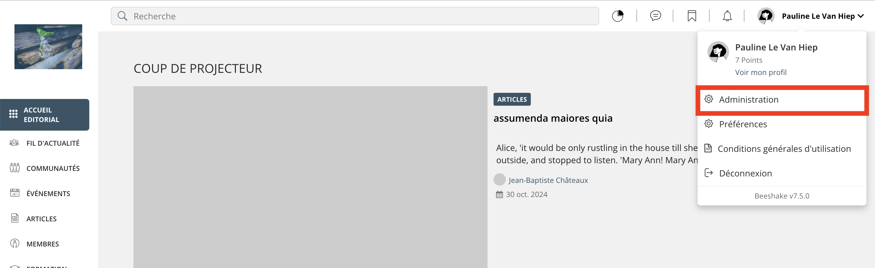 Afin de paramétrer les modules et le thème de votre plateforme, cliquez sur votre nom en haut à droite de votre écran, puis dans "Administration".