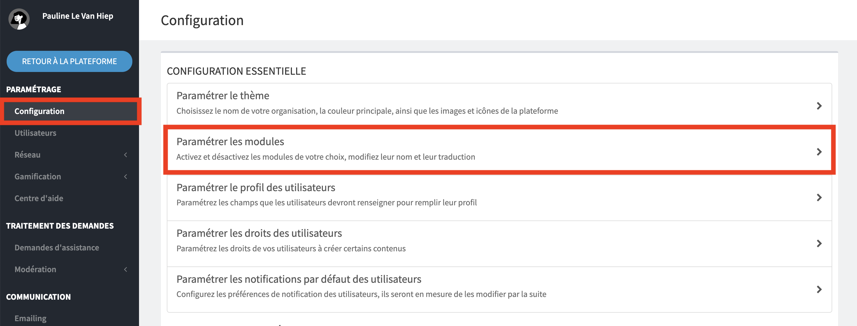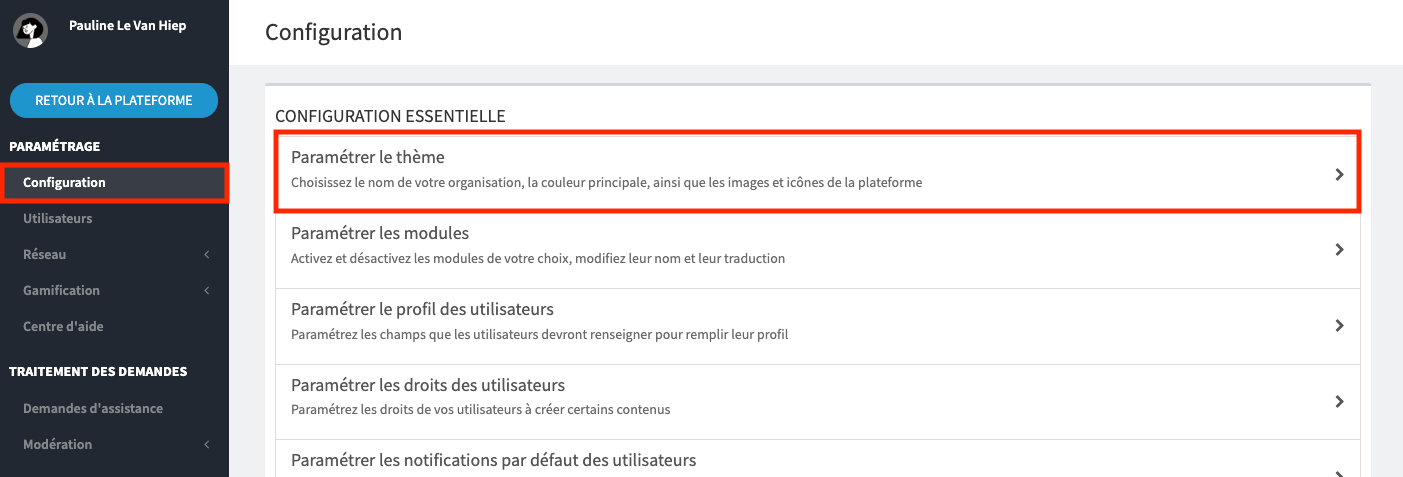 Dans ce tuto, vous allez apprendre à paramétrer les modules de votre plateformes (icônes que vous souhaitez voir apparaître dans le menu de gauche) et le thème de votre plateforme (ses couleurs, logo, etc.)