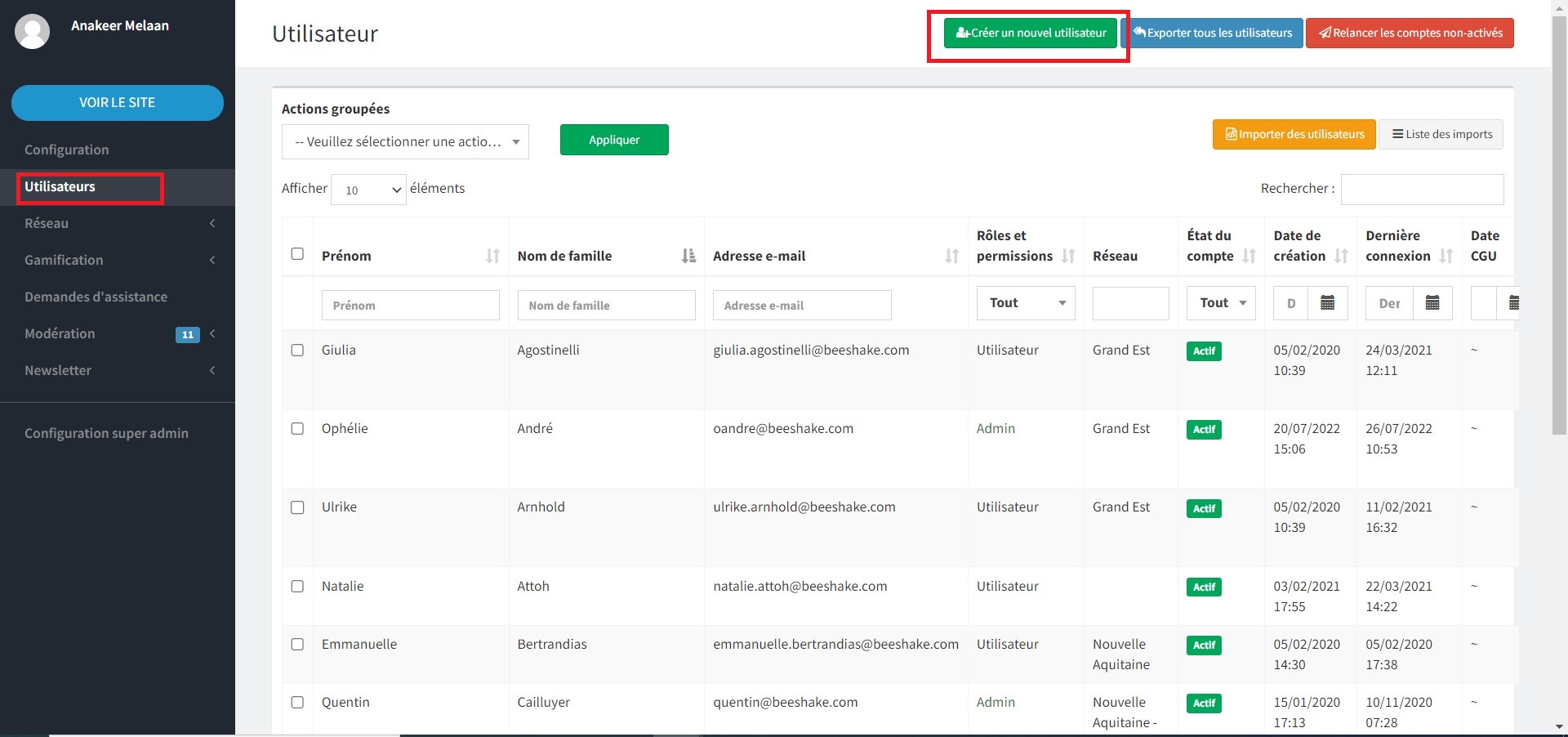 Rendez-vous dans le menu "Utilisateurs" de la sidebar à gauche de votre écran, et cliquez sur le bouton "Nouvel utilisateur".