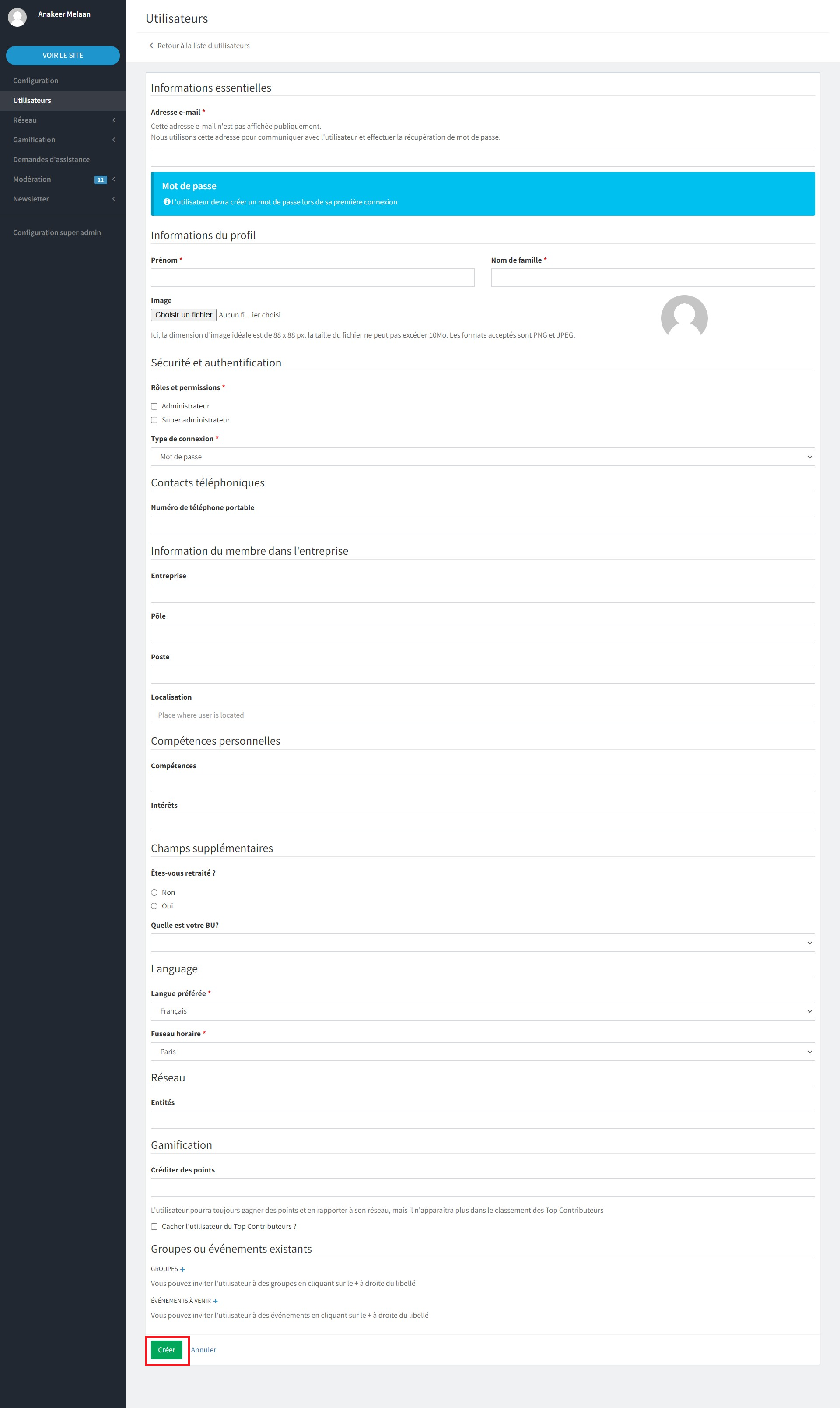 Renseignez ensuite son adresse e-mail, prénom, nom de famille, poste, localisation, langue préférée (anglais ou français), fuseau horaire.