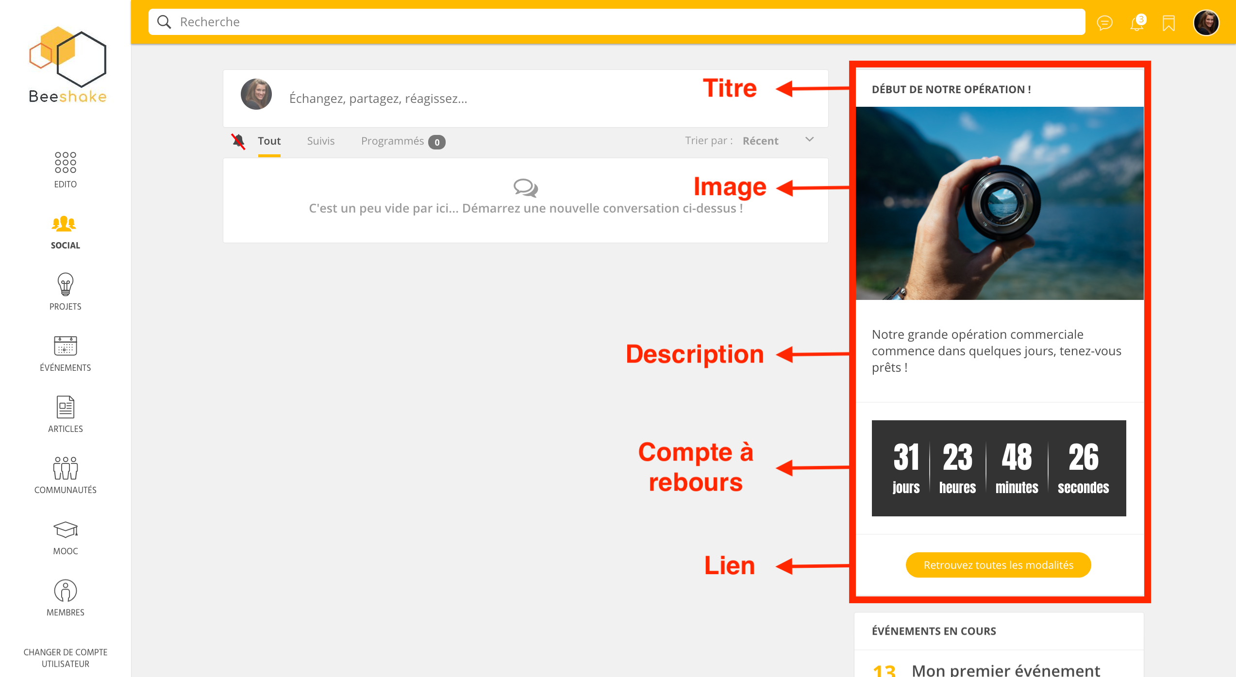 - Une image (que vous uploadez) ou le contenus que vous souhaitez faire remonter (les 5 derniers articles ou projets publiés sur la plateforme)