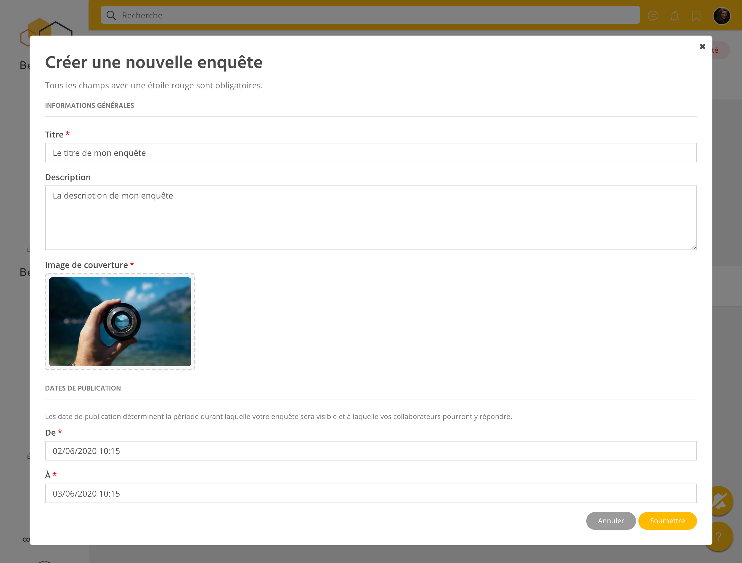 Renseignez les informations de votre enquête (titre, description, image, dates de publication et de fin de l'enquête) puis cliquez sur le bouton "Soumettre"