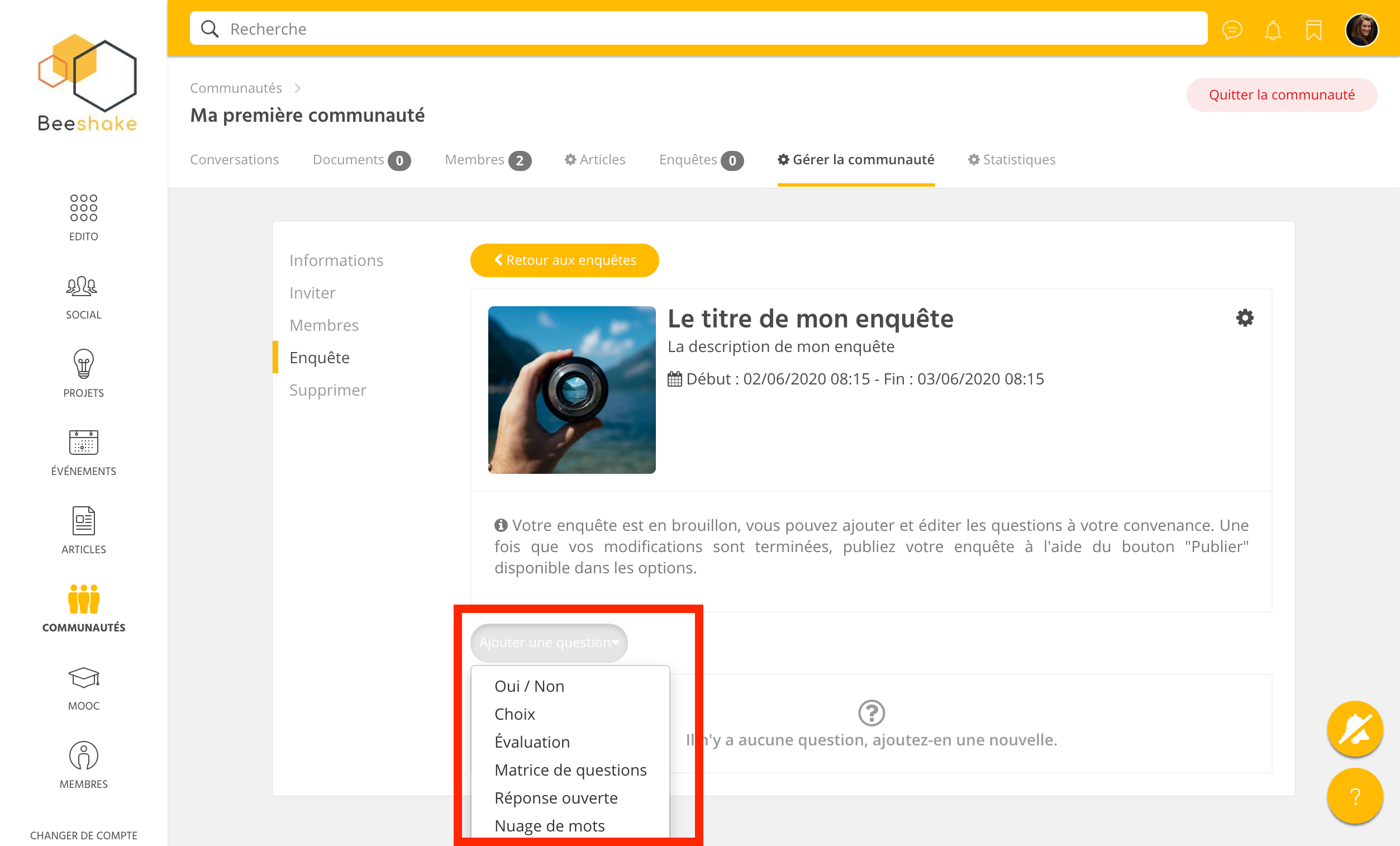 Il est temps de créer les questions qui vont composer votre enquête. Pour cela, cliquez sur le bouton "Ajouter une question" et choisissez un parmi les 6 formats de questions proposés. Vous pouvez créer autant de questions que vous le souhaitez.