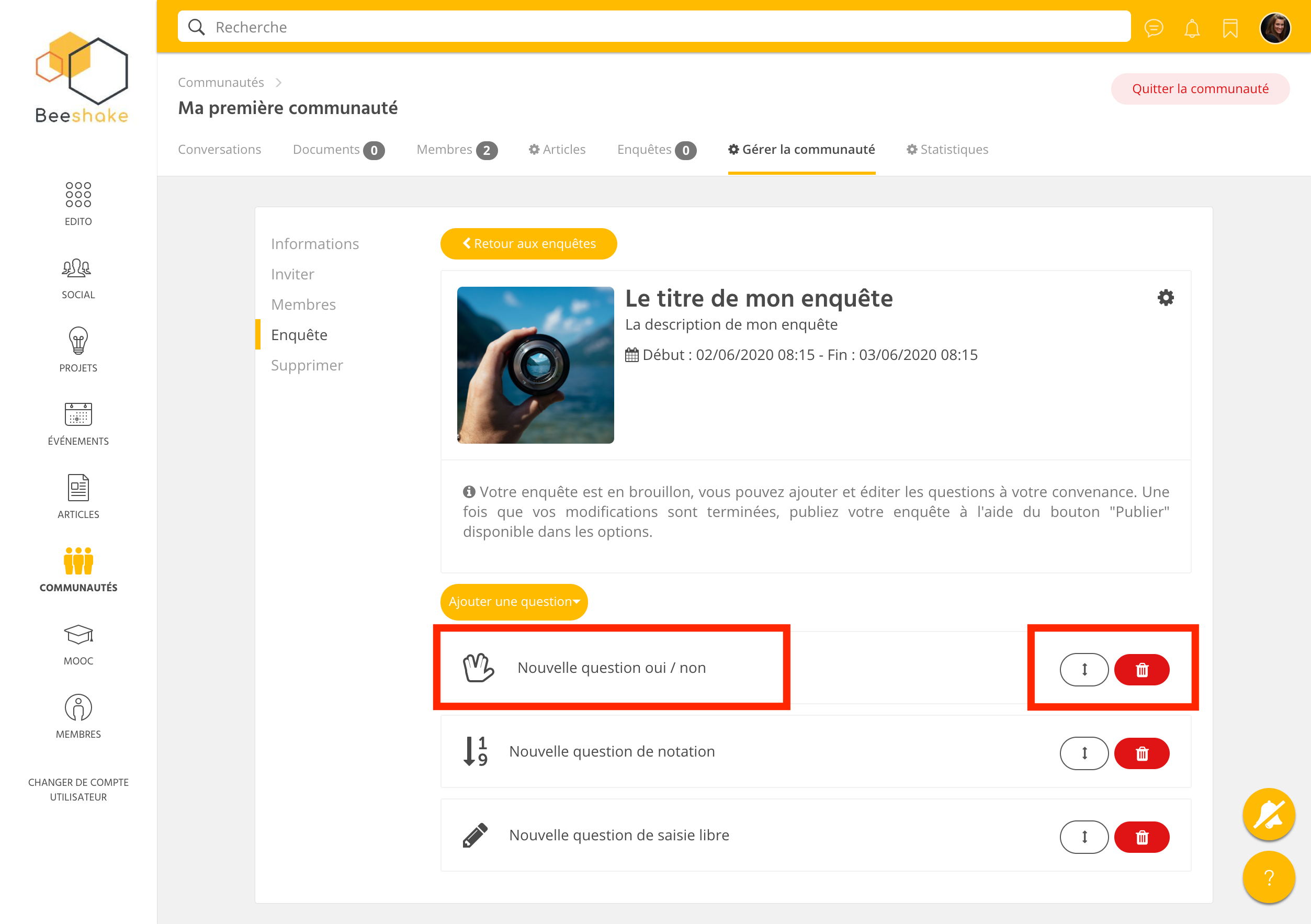 Pour éditer une question, il vous suffit de cliquer sur la question. Vous pouvez aussi déplacer une question pour changer l'ordre, ou bien supprimer une question grâce aux boutons de droite.