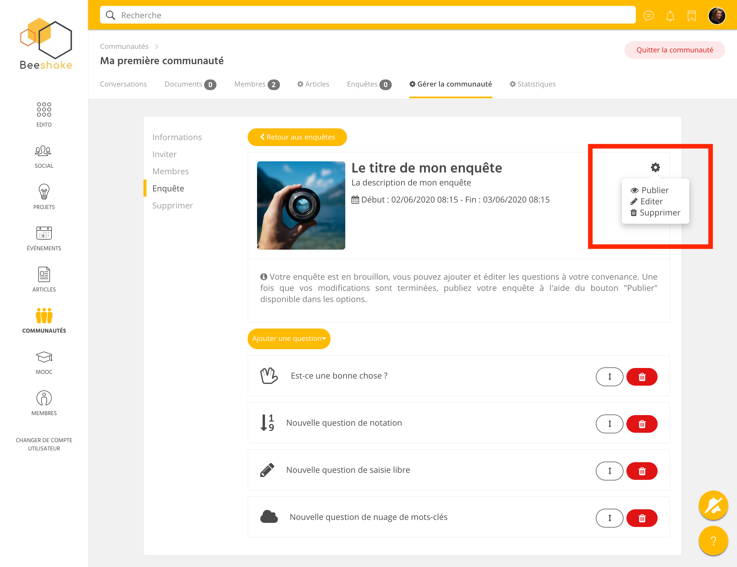 Pour cela, cliquez sur la roue crantée en haut à droite de la fenêtre de votre enquête, puis cliquez sur Publier. Vous pouvez aussi éditer les nom, description, image et dates de l'enquête en cliquant sur Éditer.