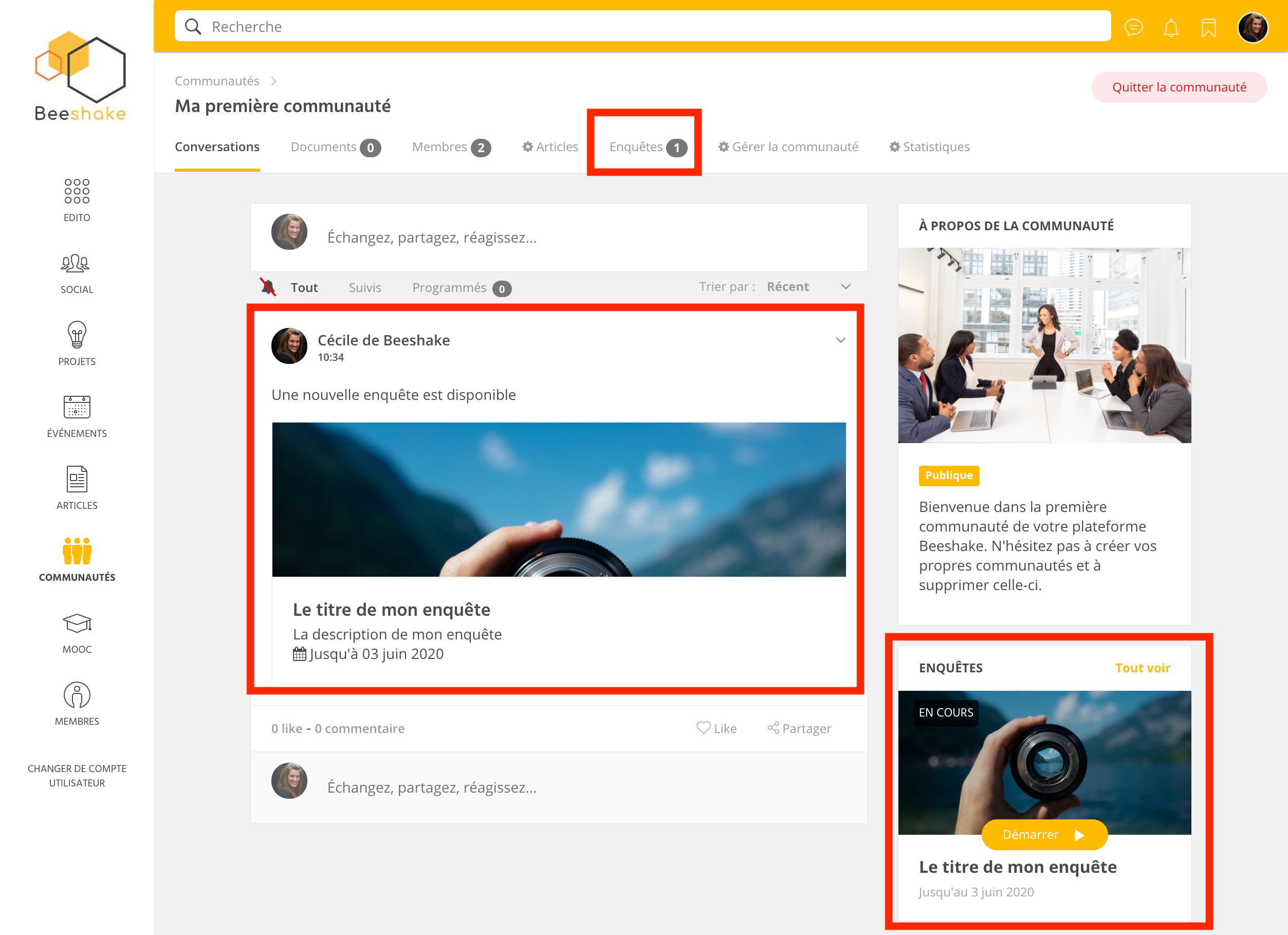 - L'onglet "Enquêtes" de la communauté indique maintenant qu'une enquête est disponible