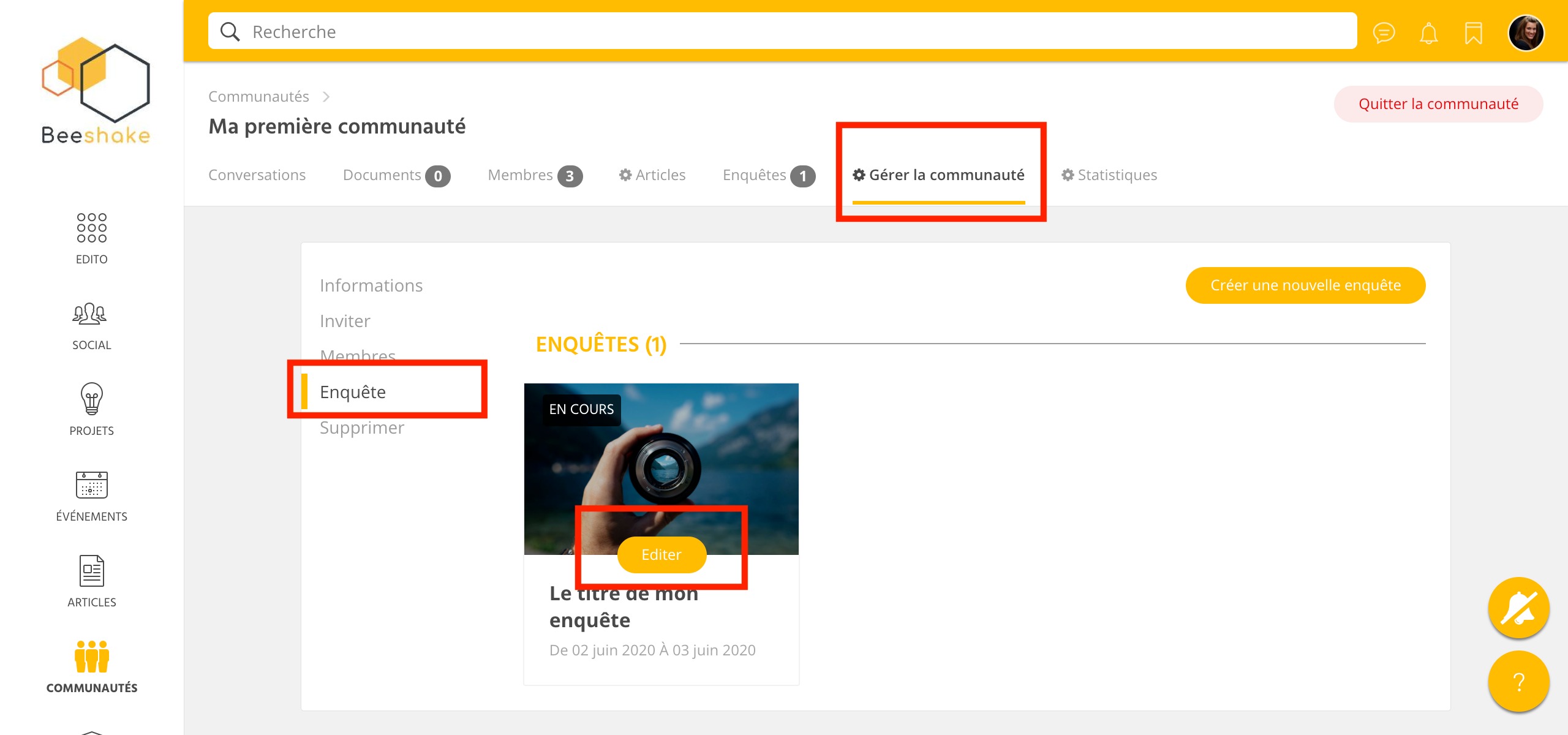 Seuls les administrateurs de la plateforme et du module Communautés peuvent accéder aux résultats des enquêtes. Pour voir les résultats, allez dans votre Communauté puis rendez-vous dans l'onglet "Gérer la communauté" puis dans "Enquêtes".