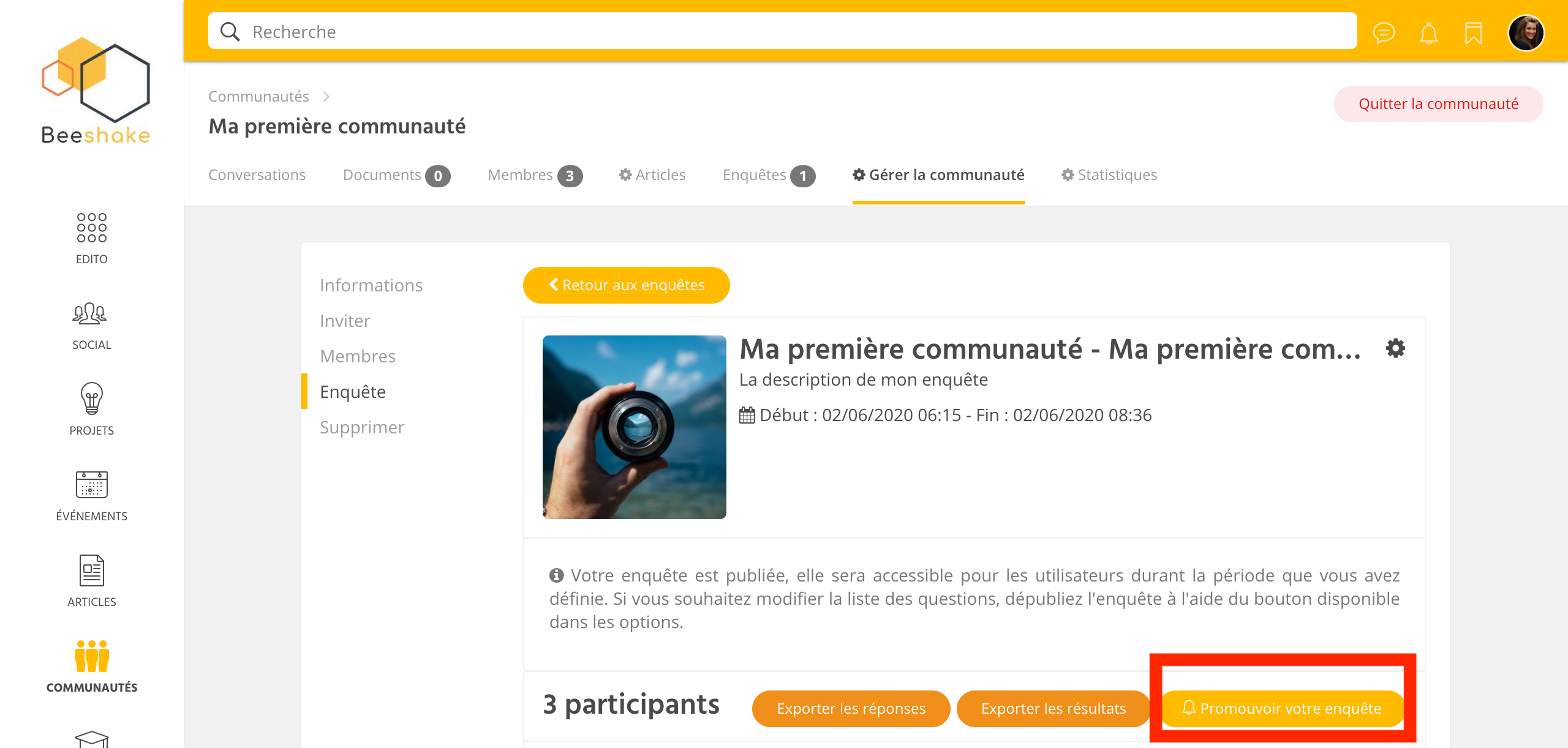 Cliquez sur le bouton "Promouvoir votre enquête" pour envoyer une notification sur la plateforme et par e-mail à tous les membres de votre communauté.