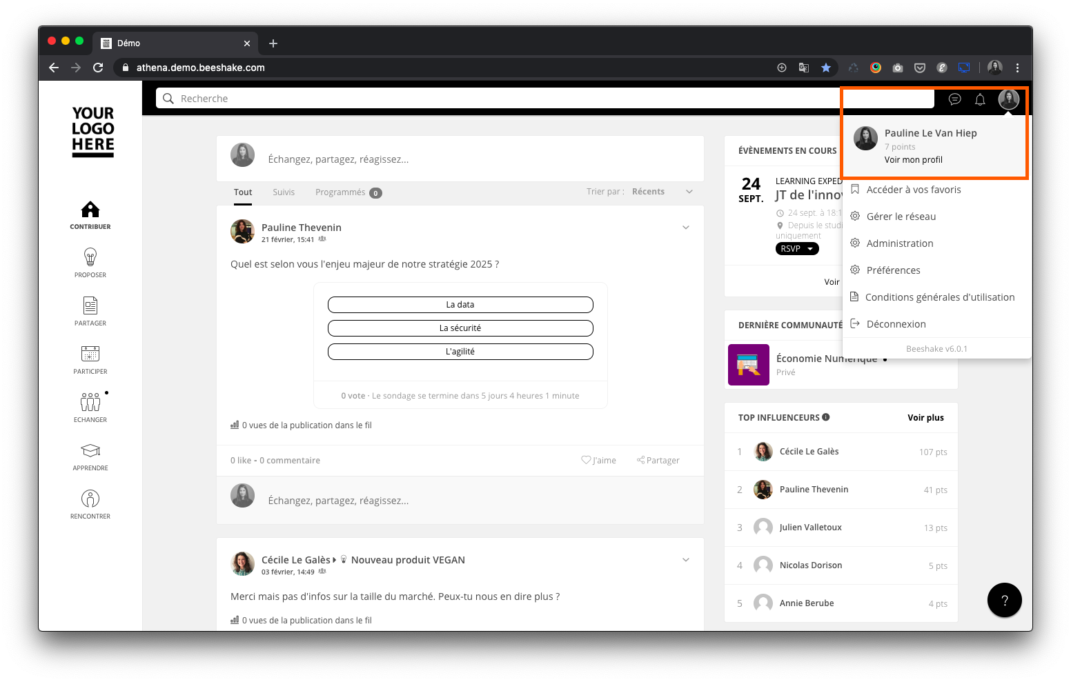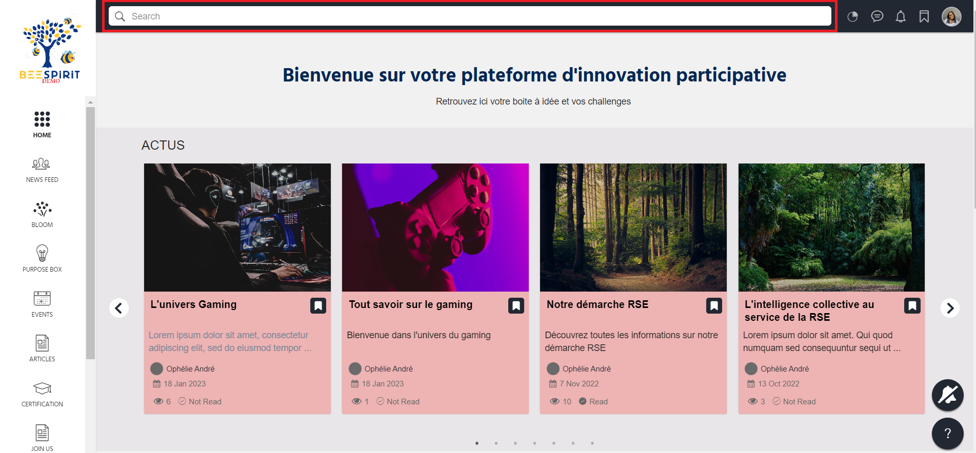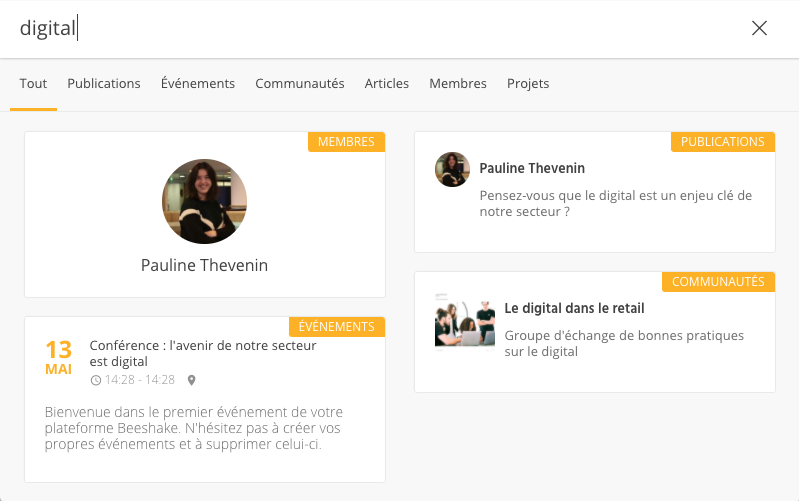 À tout moment, vous pouvez effectuer une recherche sur votre plateforme. Vous pourrez ainsi retrouver les personnes, mais aussi les événements, projets, ou tout simplement les publications associées à un mot-clé.