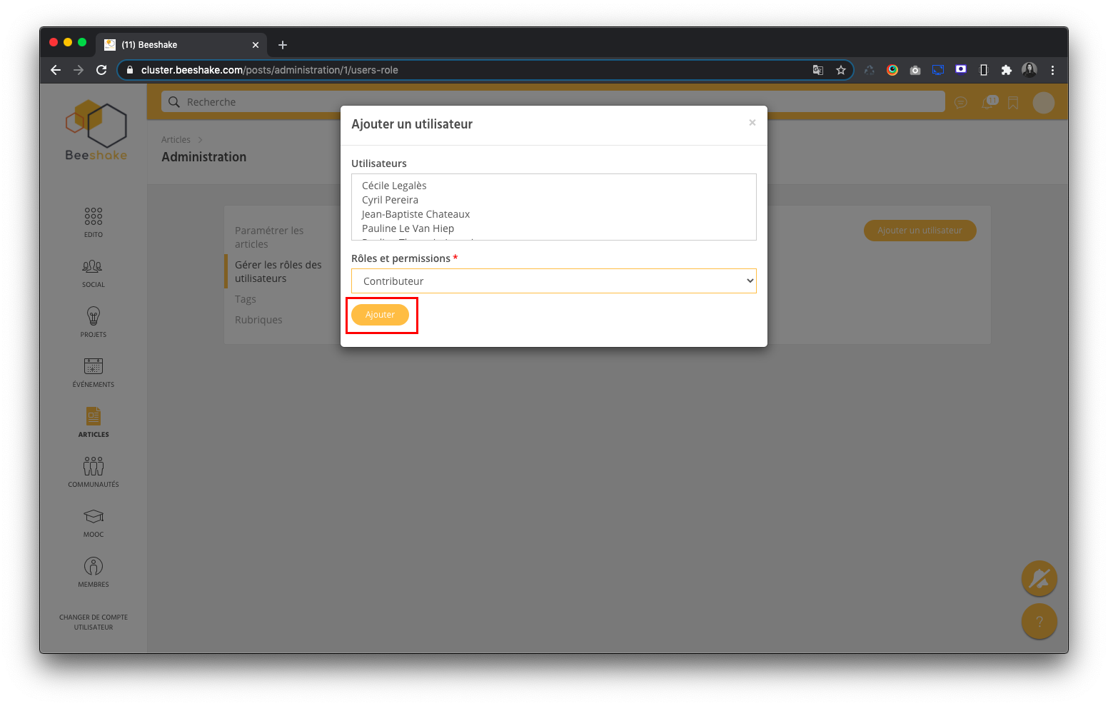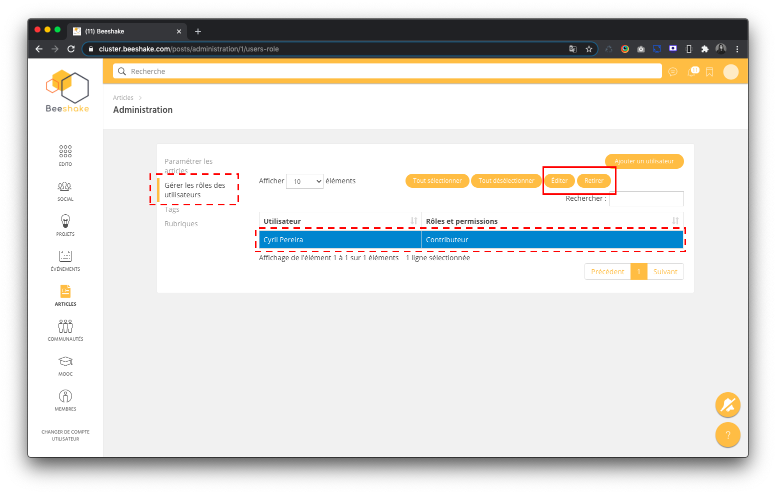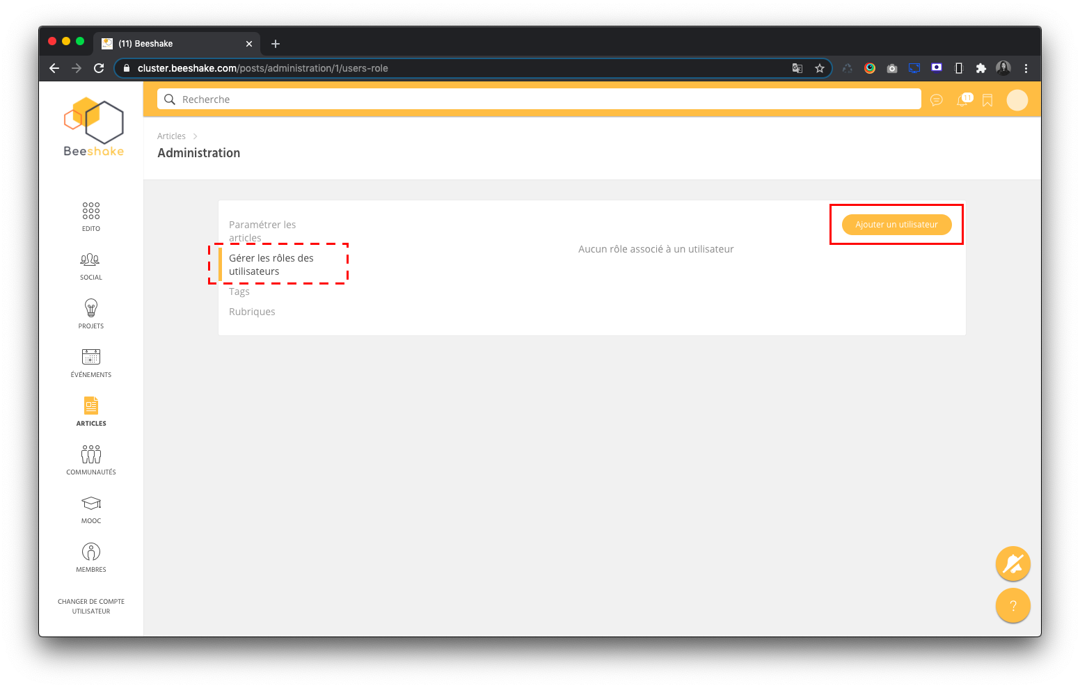 En tant qu'administrateur (de la plateforme ou du module), vous pouvez gérer les rôles de vos utilisateurs dans le module Article.
