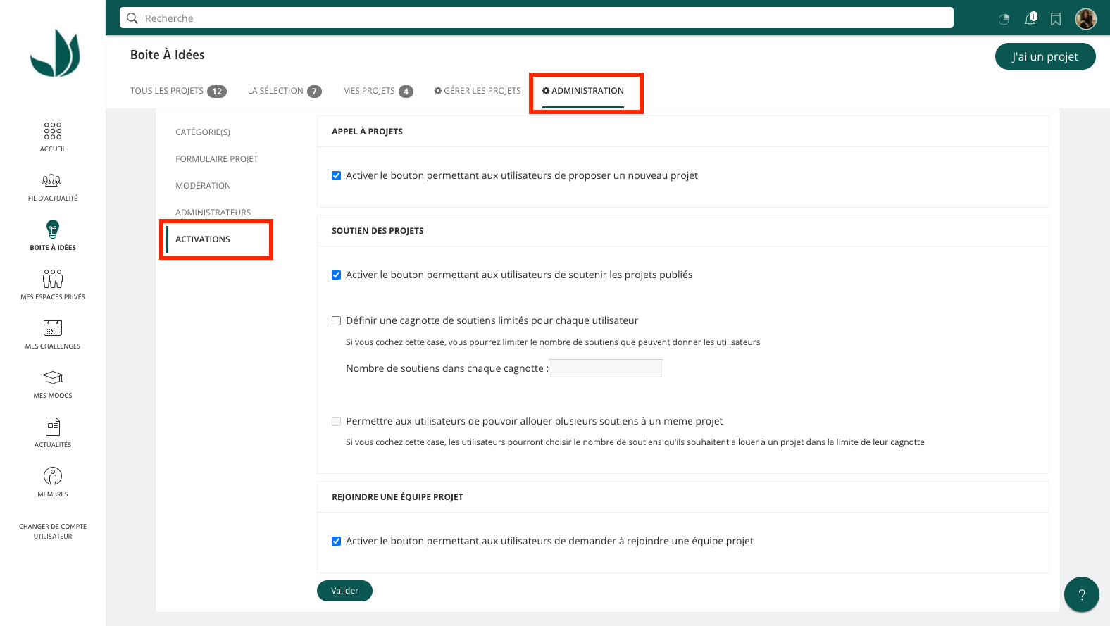 Pour paramétrer une cagnotte, rendez-vous dans le module Innovation > Administration > Activations.