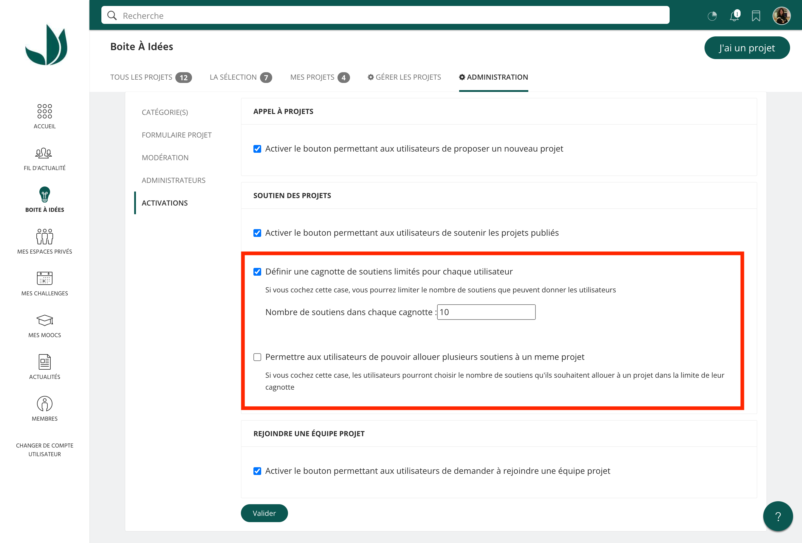 Dans le menu Administration > Activations du module Innovation, vous pouvez également cocher la case "Permettre aux utilisateurs de pouvoir allouer plusieurs soutiens à un même projet".