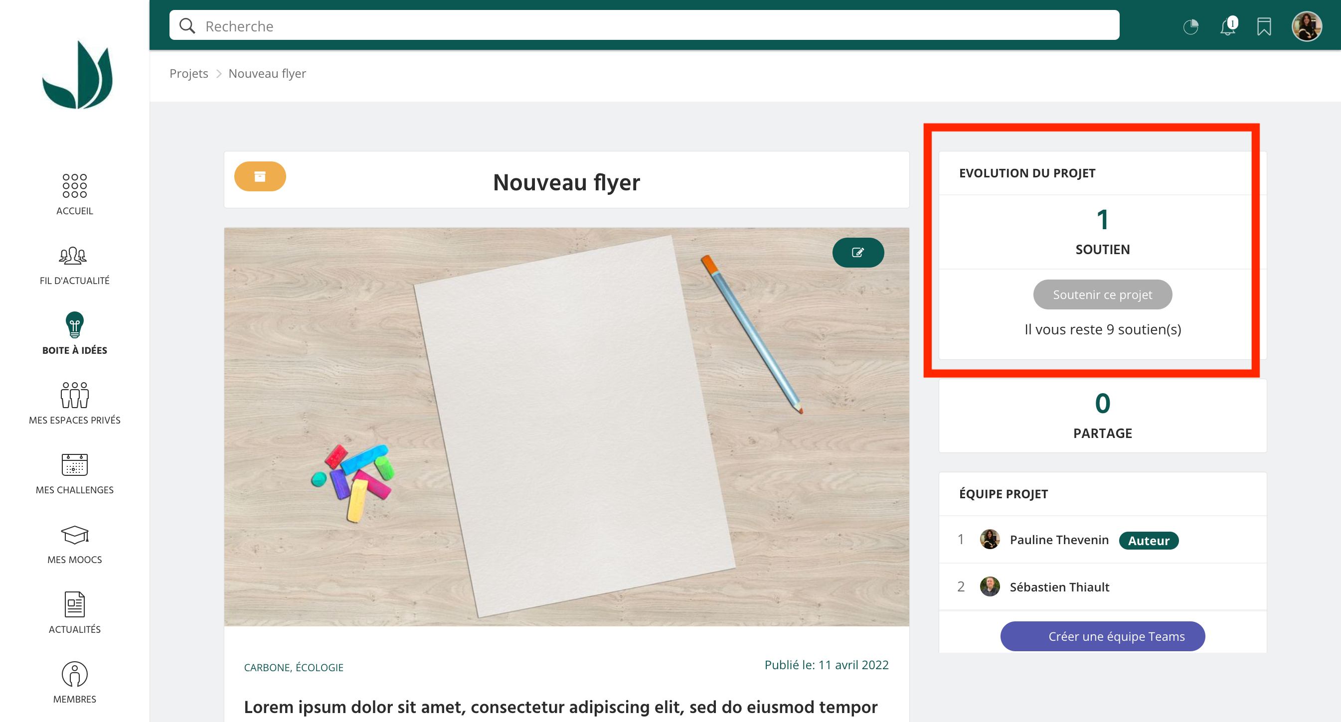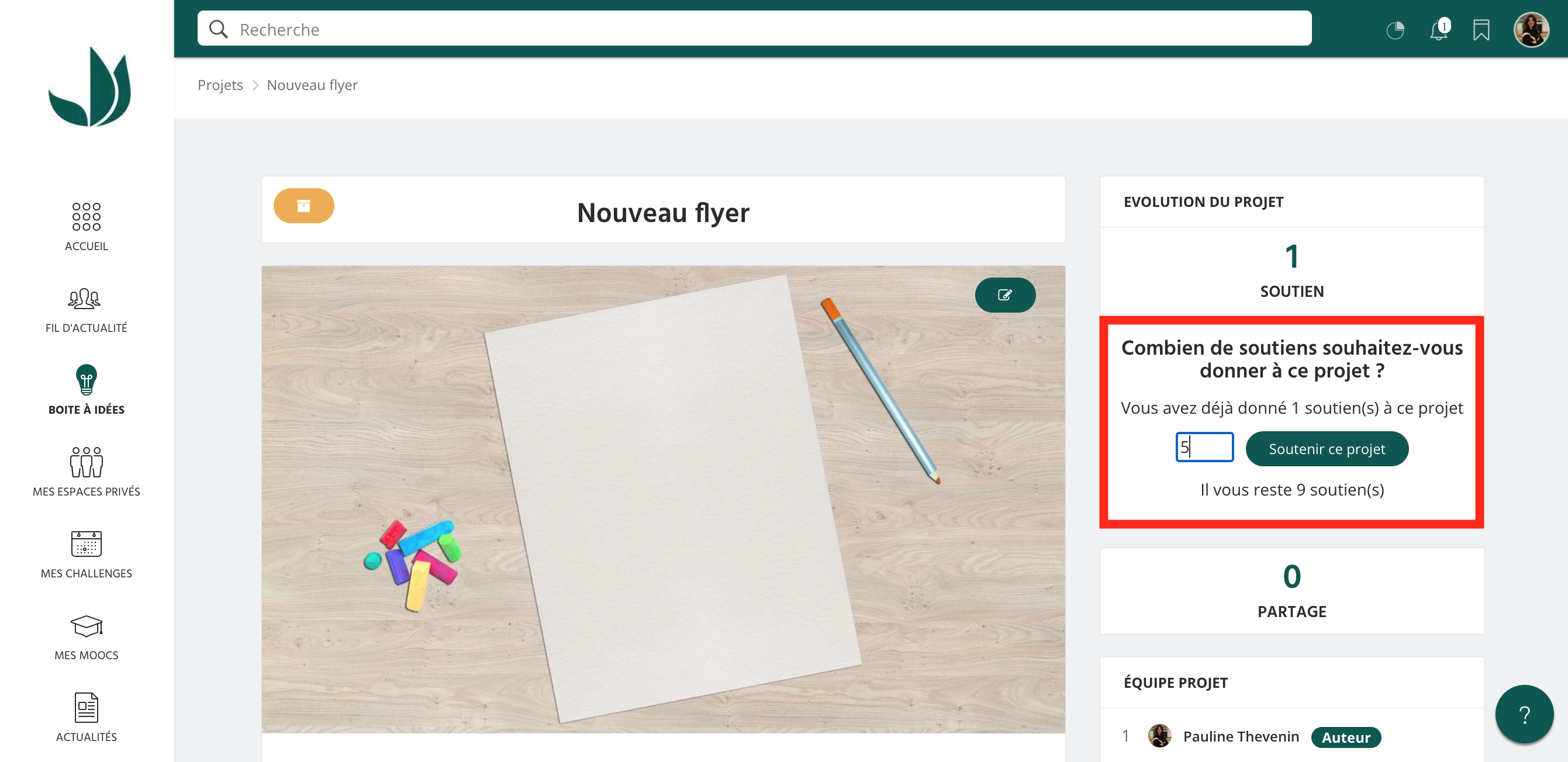 Sur la fiche d'un projet, chaque utilisateur pourra voir le nombre de soutiens qu'il a déjà donné à un projet, et choisir s'il souhaite donner davantage de soutiens