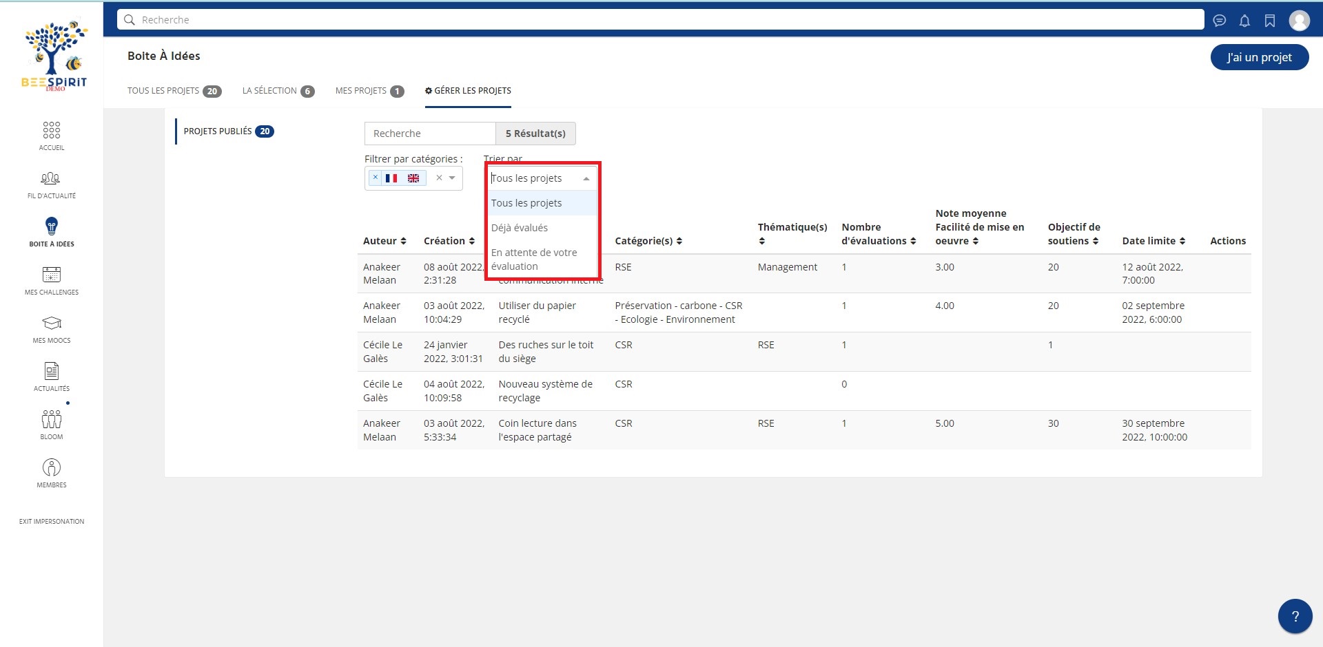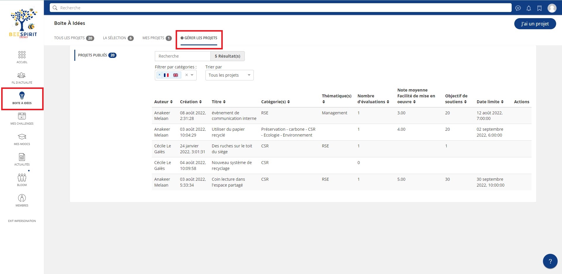 Un juré qui a la possibilité de modérer les projets par catégories, n'aura qu'à se rendre dans le module projet, puis dans l'onglet "gérer les projets".