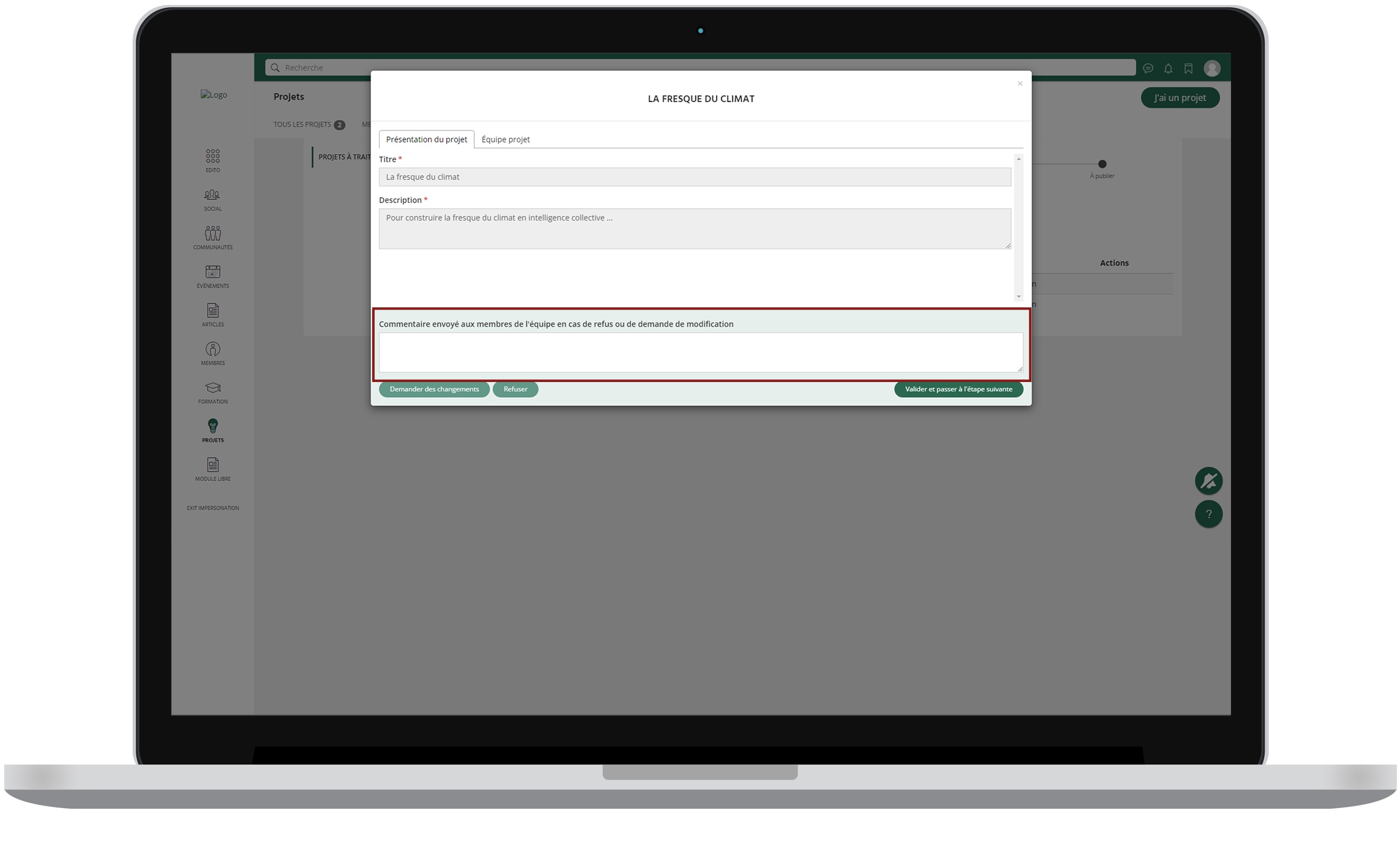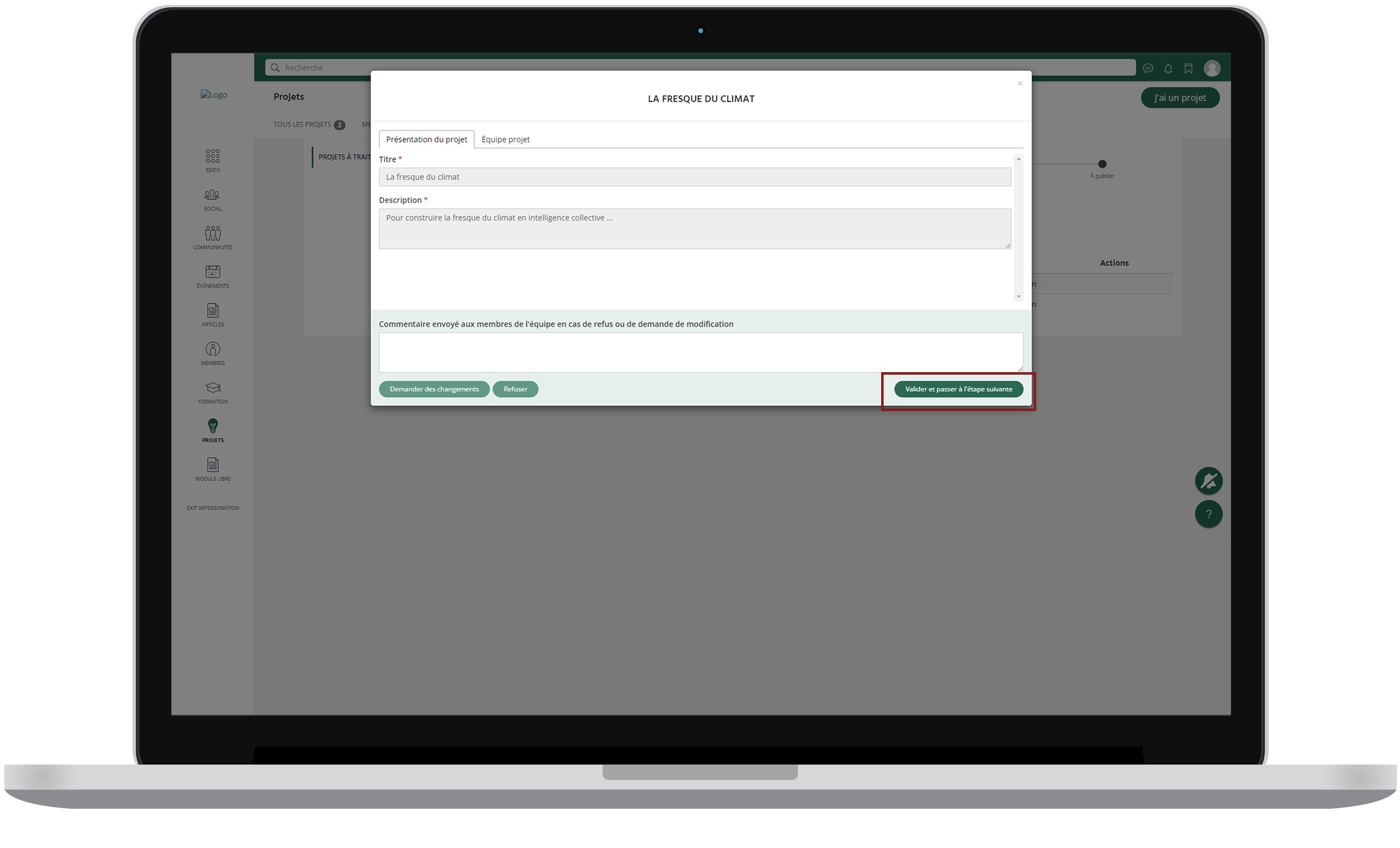 Une fois la première étape passée, le jury doit cliquer sur "Valider et passer à l'étape suivante" et ainsi de suite jusqu'à publication du projet.